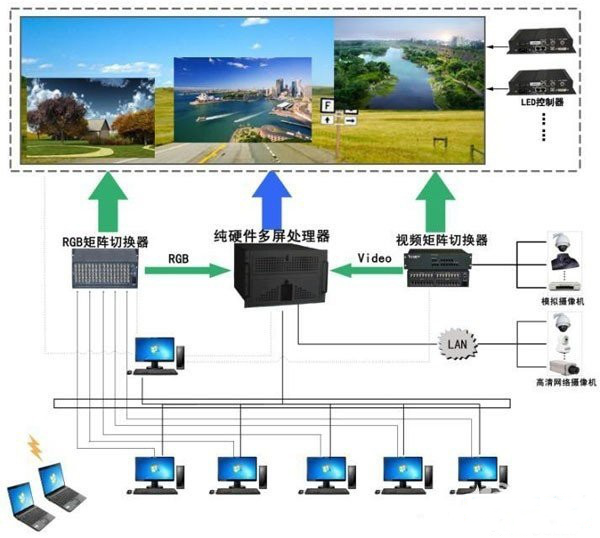 如上圖所示,一個完整的小間距LED顯示屏系統(tǒng)包含了后端的小間距LED顯示處理系統(tǒng)和前端的圖像拼接處理系統(tǒng),通過一套大屏幕控制管理軟件使得系統(tǒng)中各個硬件設(shè)備有效的控制處理,最終實現(xiàn)各信號按照人們的要求上屏完美顯示。小間距LED大屏幕顯示系統(tǒng)的優(yōu)勢在于高度的系統(tǒng)集成性,整個系統(tǒng)由一套控制管理軟件集中控制及管理,除進行圖像處理系統(tǒng)、顯示單元設(shè)備管理、控制各種信號顯示方式外,還可以控制RGB矩陣、視頻矩陣等相關(guān)外圍設(shè)備,使多個系統(tǒng)達到高度集成、集中控制。大屏幕系統(tǒng)的關(guān)鍵部件——微間距LED顯示單元、純硬件多屏處理器和大屏控制管理軟件需要采用同一品牌,并全部采用針對性兼容銜接設(shè)計,在保證系統(tǒng)兼容性同時提供可靠安全保障。顯示單元、圖像控制器和控制軟件作為整套大屏幕系統(tǒng)的核心部分,如果采用不同廠家產(chǎn)品進行集成,很可能會產(chǎn)生技術(shù)兼容性問題,影響很多重要功能的實現(xiàn),降低系統(tǒng)的可靠性和使用效率;另一方面因涉及到多個廠商,很可能出現(xiàn)售后維護時影響故障診斷和備品備件的及時供應(yīng)等問題,同時可能對系統(tǒng)的升級無法保持一致,降低系統(tǒng)的擴展性。由此可見要保證小間距LED顯示屏系統(tǒng)能夠完美顯示并連續(xù)不斷的可靠運行,只有優(yōu)良品質(zhì)的LED顯示單元是遠(yuǎn)遠(yuǎn)不夠的,具備良好兼容性和優(yōu)良性能的圖像處理器也是不可或缺的一環(huán),下面我就小間距LED顯示屏的圖像拼接器技術(shù)做一個解讀: